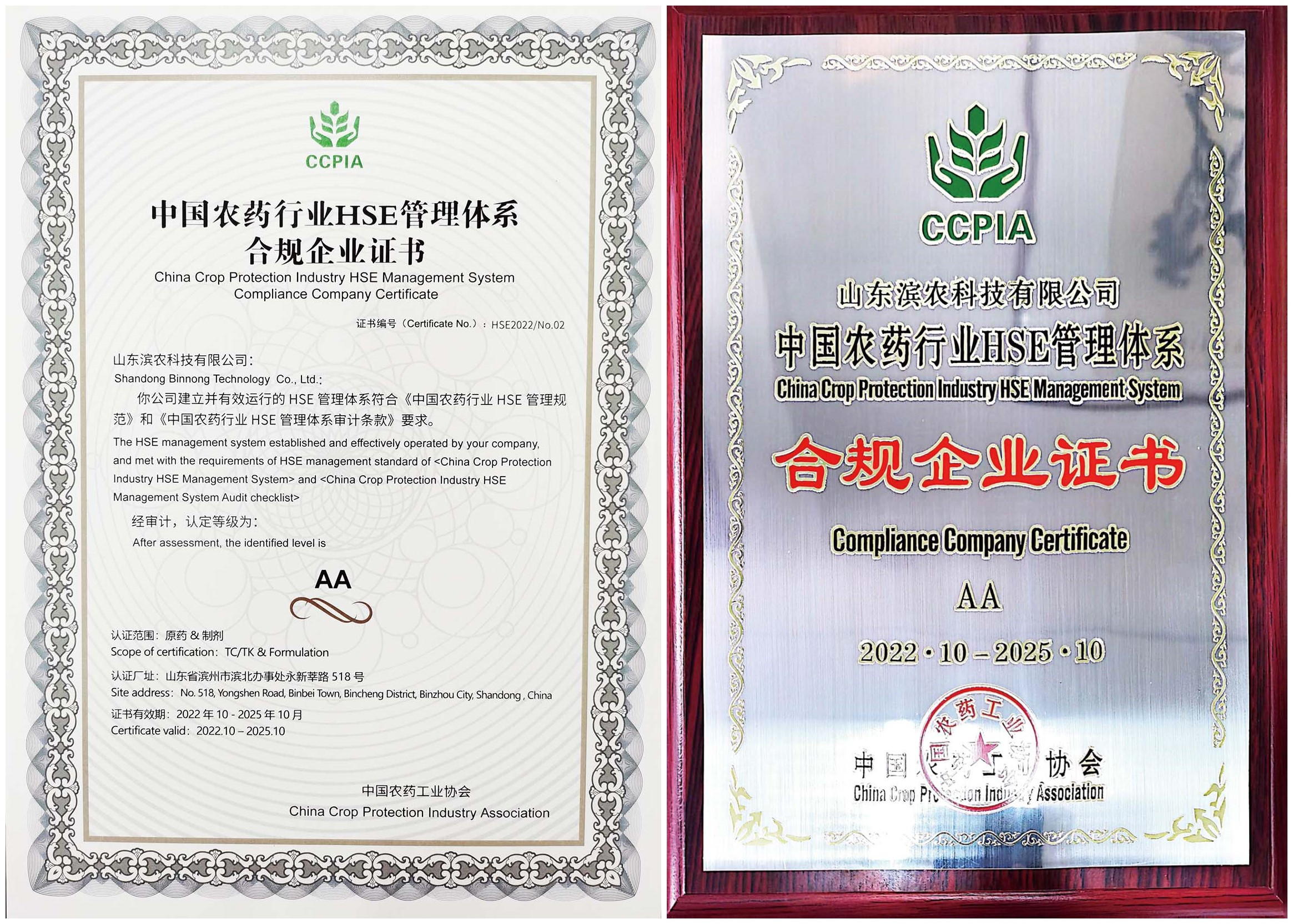 濱農(nóng)科技通過(guò) “中國(guó)農(nóng)藥行業(yè)HSE管理體系合規(guī)企業(yè)”認(rèn)證復(fù)審發(fā)布時(shí)間:2023-04-20 15:32